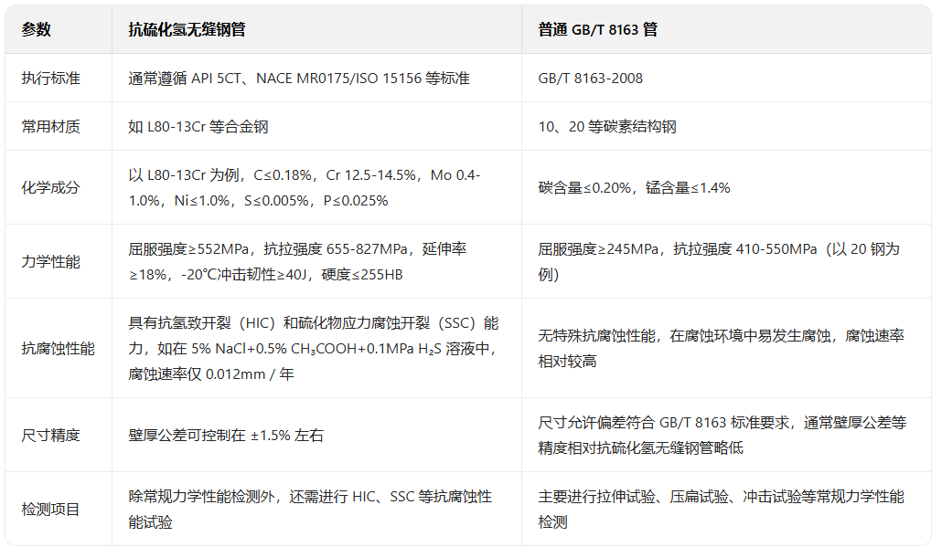 以下是抗硫化氢无缝钢管与普通 GB/T 8163 管的详细参数对比表: